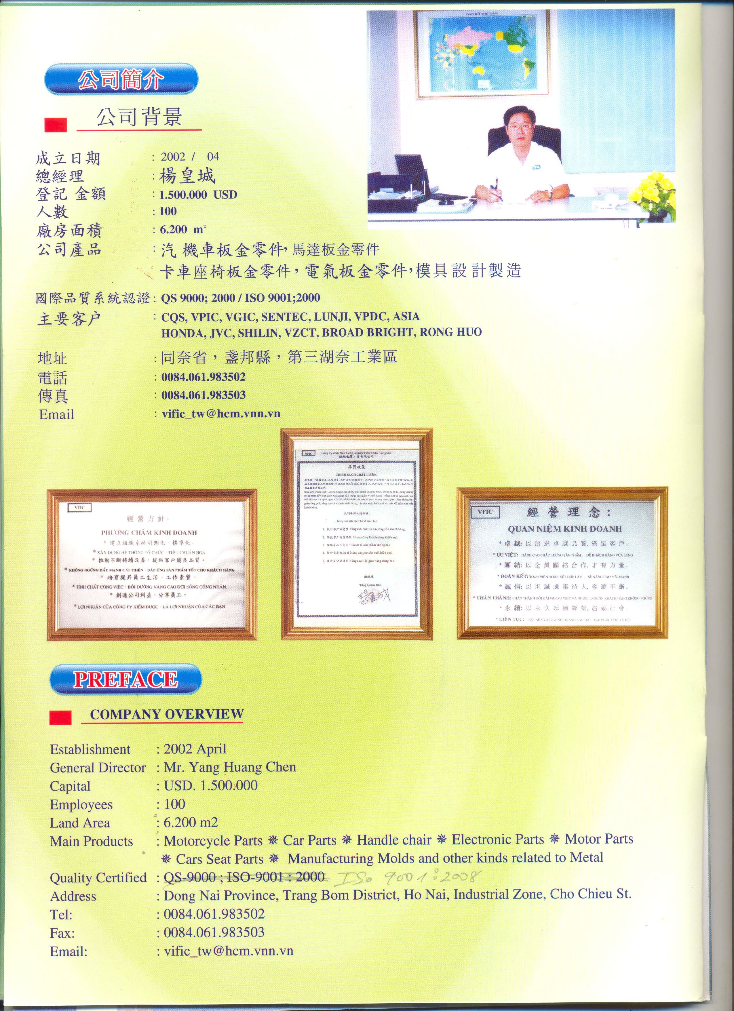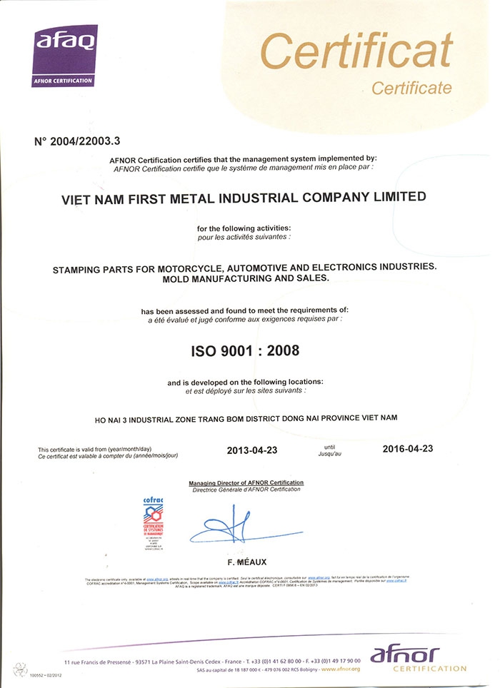 Thành lập từ tháng 4 năm 2002, chuyên sản xuất và gia công dập định hình các loại linh kiện, phụ tùng bằng kim loại dùng cho xe ô tô và xe gắn máy, linh kiện điện, điện tử, thiết kế và gia công khuôn mẫu kim loại, khuôn dập tôn Silic tự động; sản xuất và gia công các loại linh kiện đồ gia dụng, các loại khóa tủ điện, bản lề tủ điện, sản xuất và gia công các mặt hàng Rotor & Stator dùng cho quạt điện, Rotor & Stator máy bơm nước & motor các loại. Sản xuất và gia công các loại linh kiện, dụng cụ nam châm hít nhả sắt tự động, kẹp an toàn, ống nam châm thu hàng bằng kim loại, mâm hấp thực phẩm, bình phòng cháy chữa cháy, mắt kính đeo bằng kim loại. Vốn đầu tư: 2.000.000 USD Diện tích: 6.250 m2 Tổng số nhân viên: 100 người Giấy chứng nhận chất lượng: ISO 9001 : 2008 do tổ chức AFAQ cấp. Khách hàng chủ yếu: VPIC, CLS, VZCT, SHENG BANG, WINTEK, SENTEC VIỆT NAM, MOMENTUM, BONFIGLIOLI, GEO GEAR, QUẠT ĐIỆN ÁNH NGA, MOTOR QUẠT ĐIỆN LÊ CẢNH, QUẠT ĐIỆN HỮU THÀNH, KIM CỬU LONG, TIGER VIỆT NAM, SONOR VIỆT NAM, ... PHƯƠNG CHÂM KINH DOANH CỦA CHÚNG TÔI: · ƯU VIỆT · ĐOÀN KẾT · THÀNH TÍN · LIÊN TỤC. HỆ THỐNG QUẢN LÝ CHẤT LƯỢNG CỦA CHÚNG TÔI:: · Không ngừng cải thiện · Chất lượng hàng tốt · Khách hàng hài lòng |